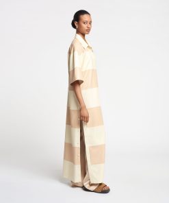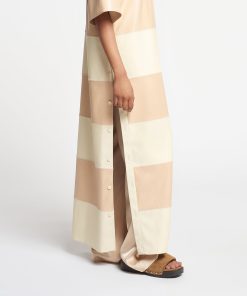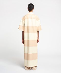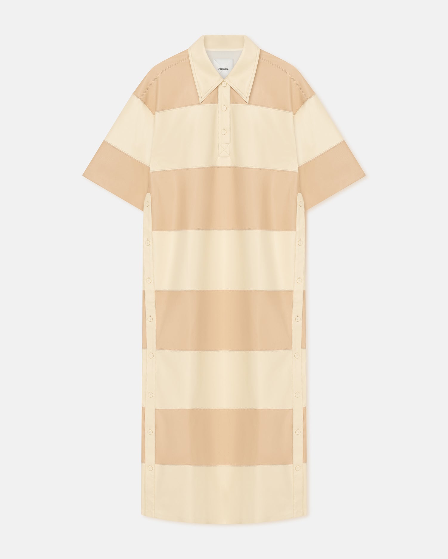 The Robbie dress is made from our signature alt-leather in a patchwork of peach and vanilla stripes. It has a polo-style collar, wide sleeves and button-fastening side slits.
