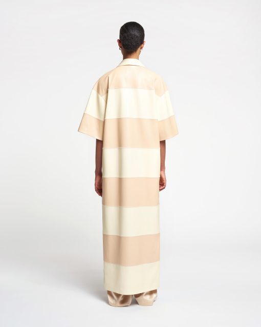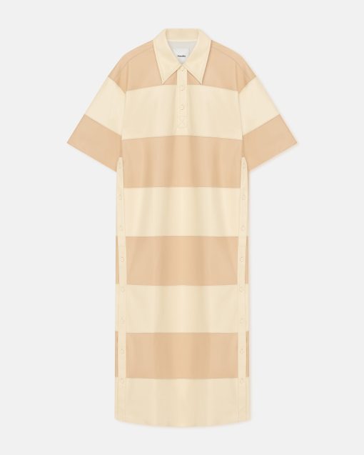 The Robbie dress is made from our signature alt-leather in a patchwork of peach and vanilla stripes. It has a polo-style collar, wide sleeves and button-fastening side slits.