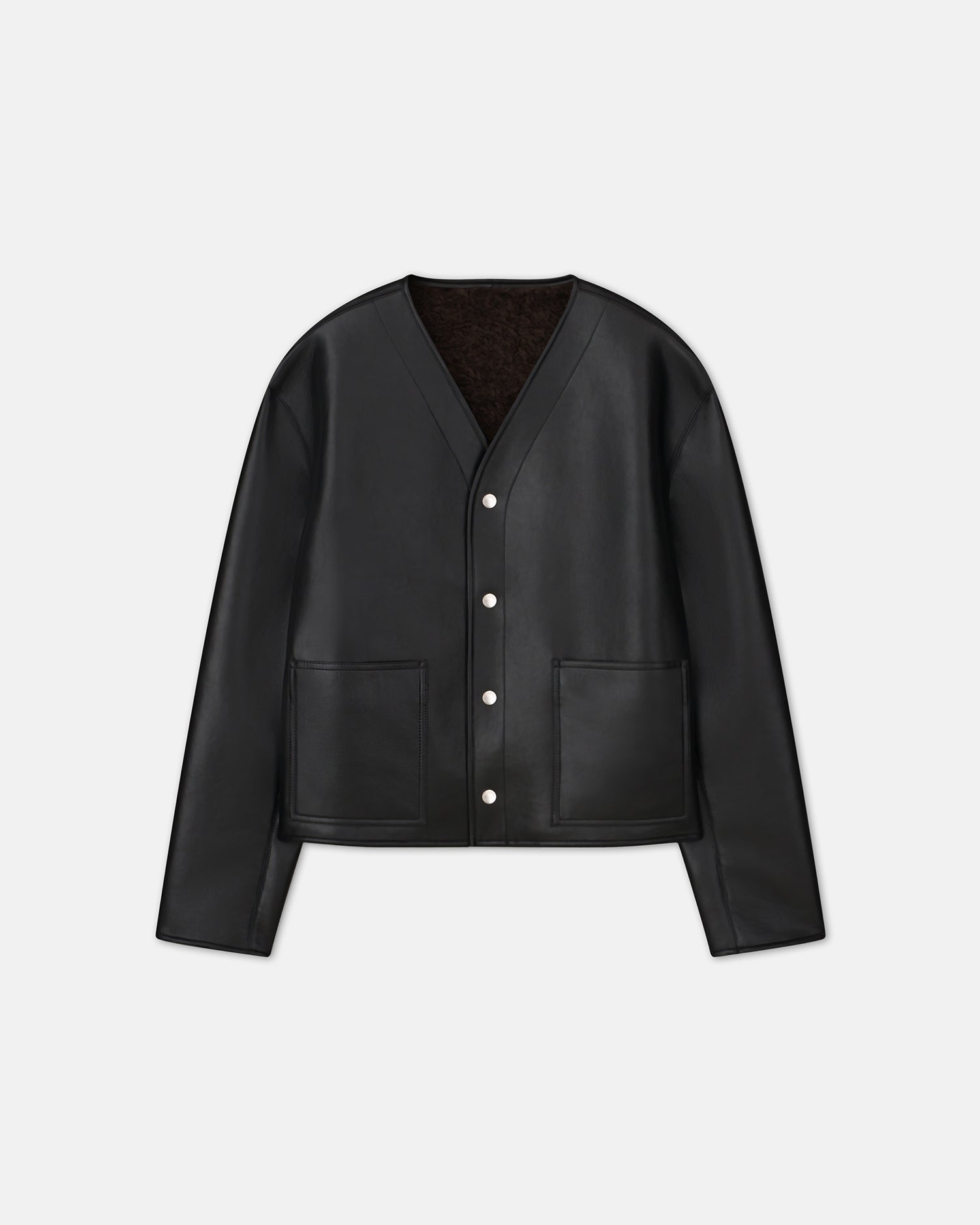 The Vico has the heft of a jacket with the easy silhouette of a cardigan. It is crafted from black regenerated leather for a loose, boxy fit, and finished with contrasting brown shearling trims.