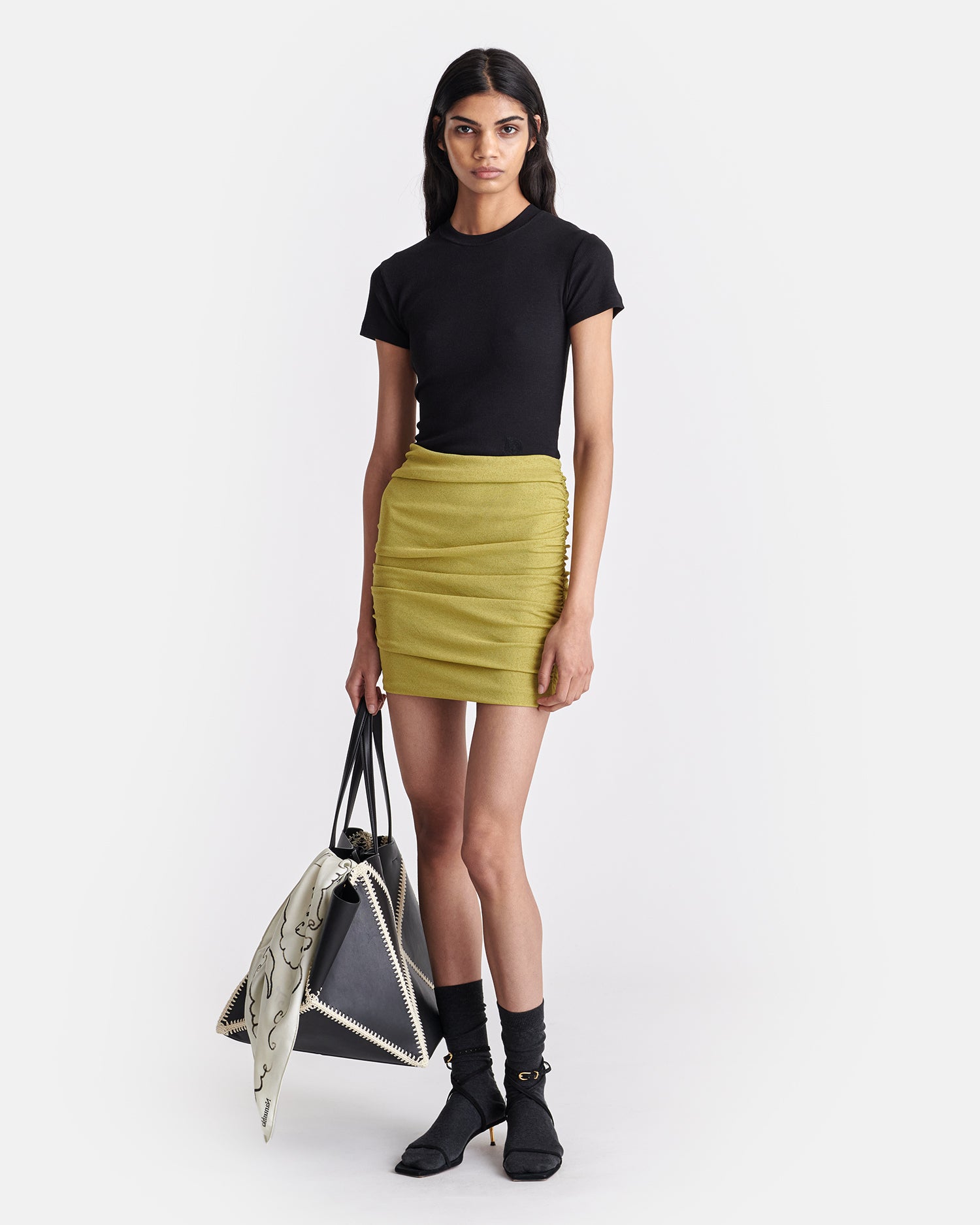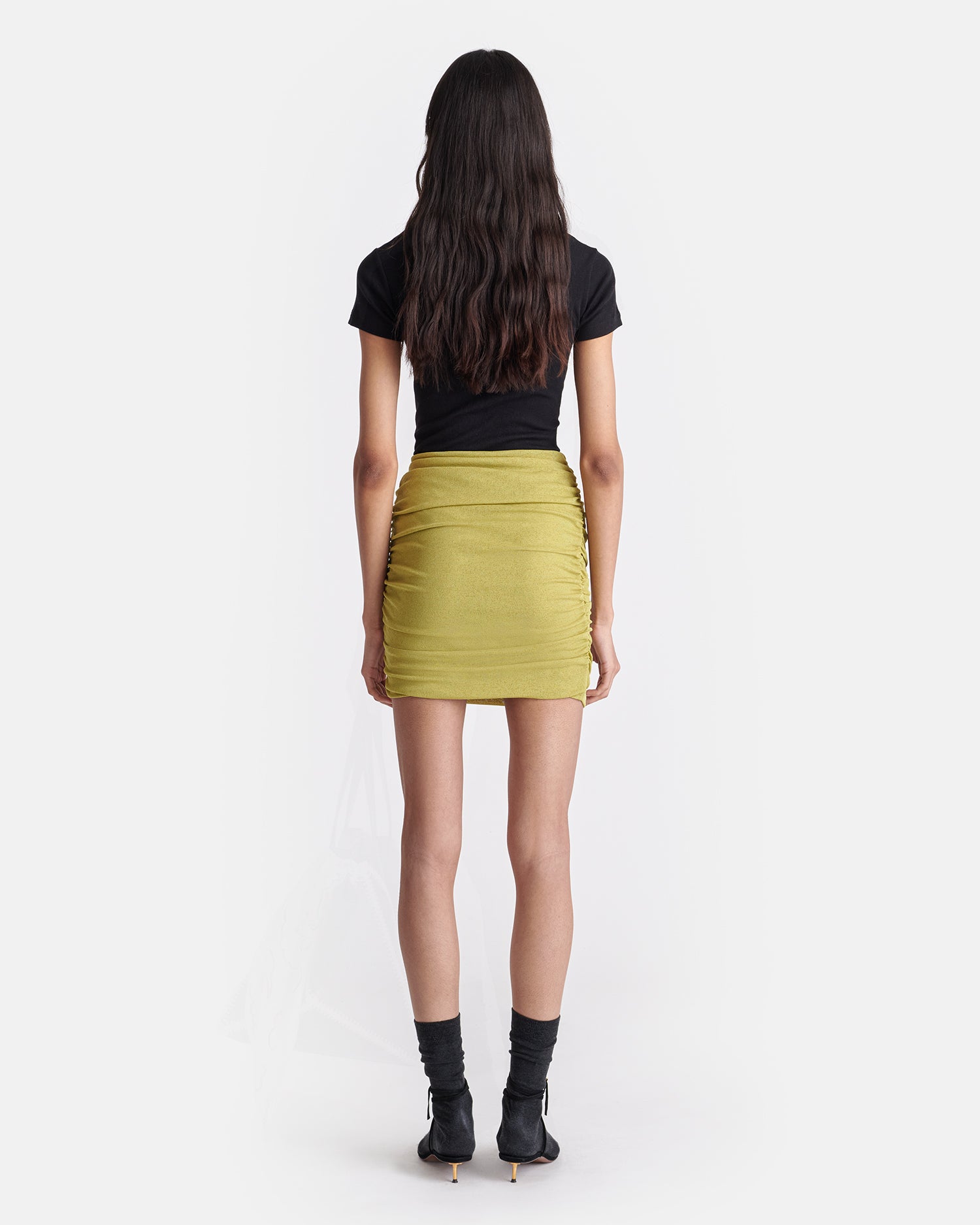 The Pamyla skirt is made from our signature mesh jersey that creates flattering draping across the waist. The pistachio tone is both statement-making and refined.