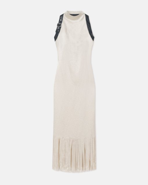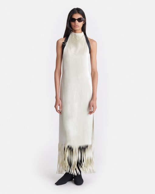 Fabric manipulation is one of our favourite design features. The Miruna dress is detailed with a wave of fringing at the hem that has been meticulously cut by hand. It’s made from crinkled satin in a timeless ecru tone and fits close through the body from the halter neckline.