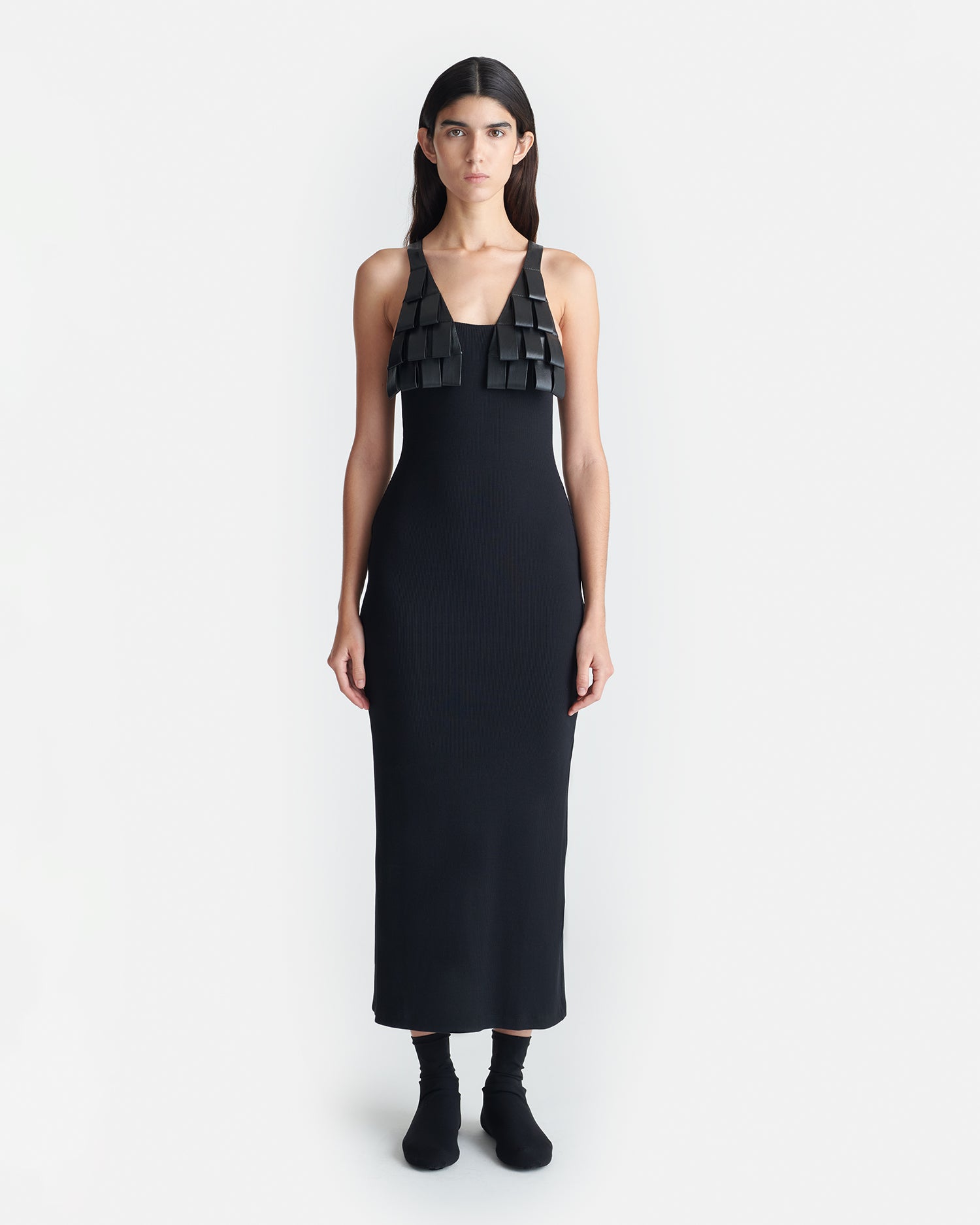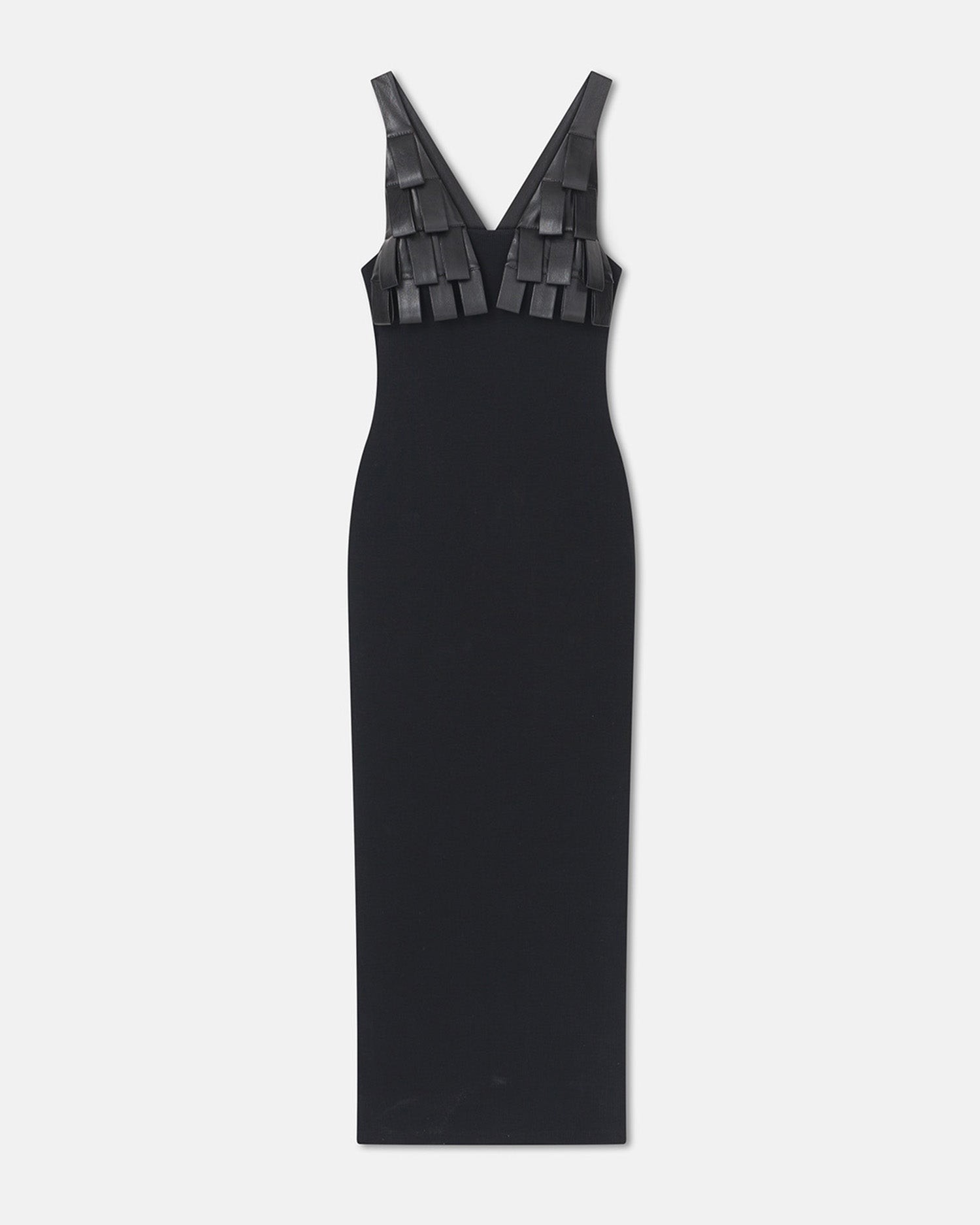 Drawing on a book on antique paper craft, we are inspired by the looped shapes created by paper for Spring/ Summer 2025. Made from ribbed jersey, the Gildah dress has a loopback fringe detail made from our signature OKOBOR™ alt-leather.