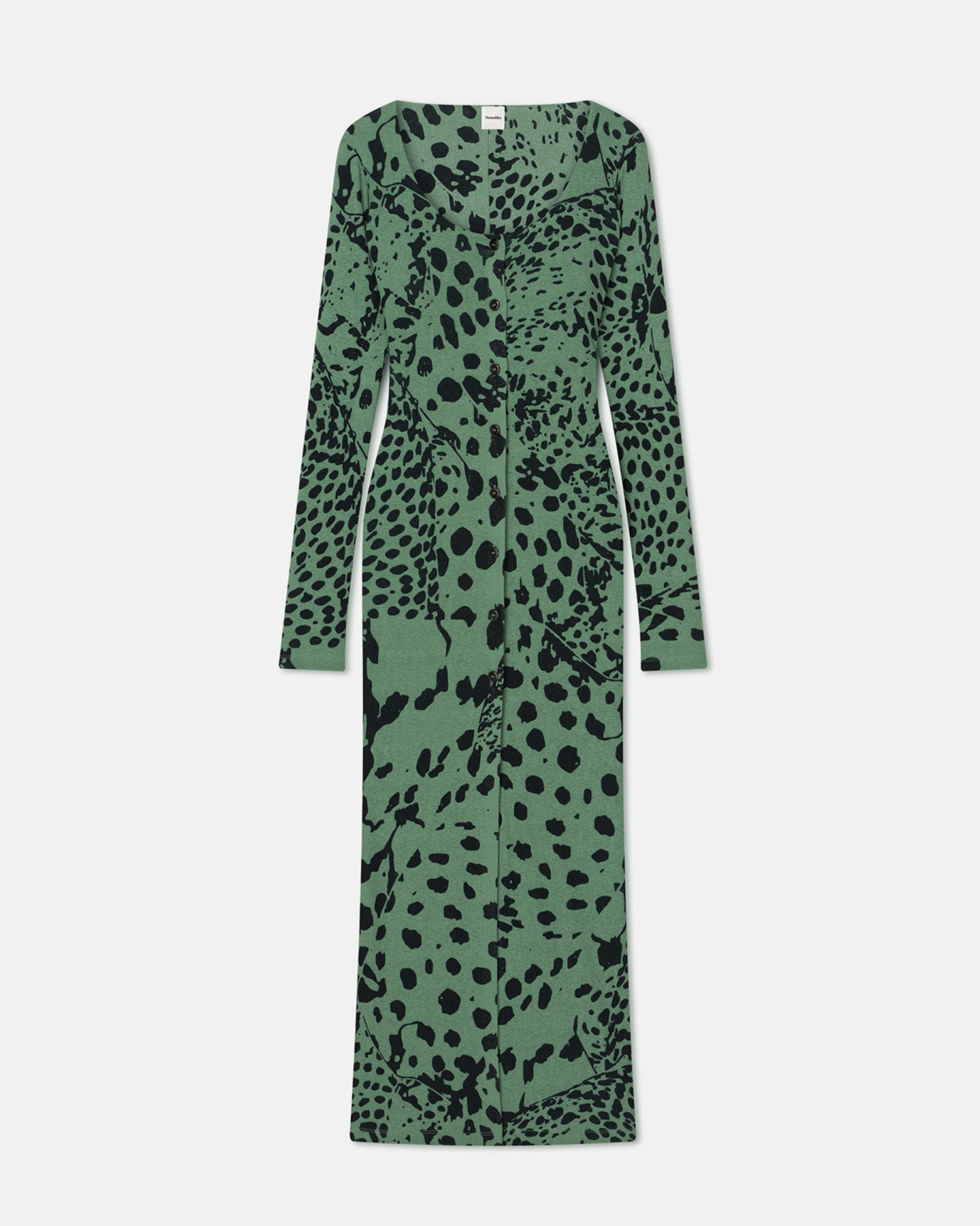 The Nareh cardigan has a longline silhouette that sculpts your frame. It’s made from our signature mesh jersey in a new-season green cheetah tone.