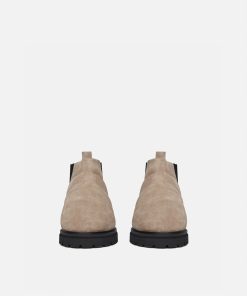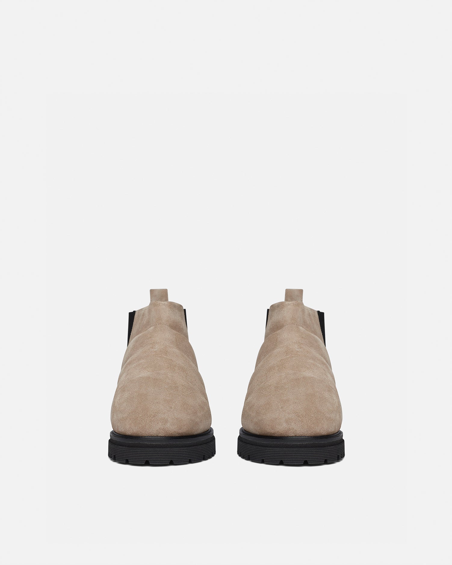 Padded stone suede gives the Bede boots a contemporary feel. Grounded with a heavy tread sole and finished with a rounded toe, elasticated sides and pull tabs allow for pull-on, kick-off ease.